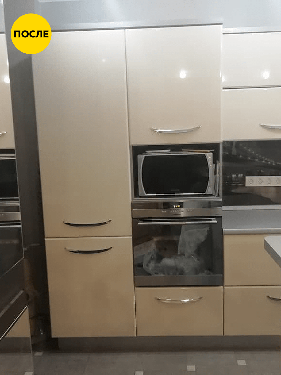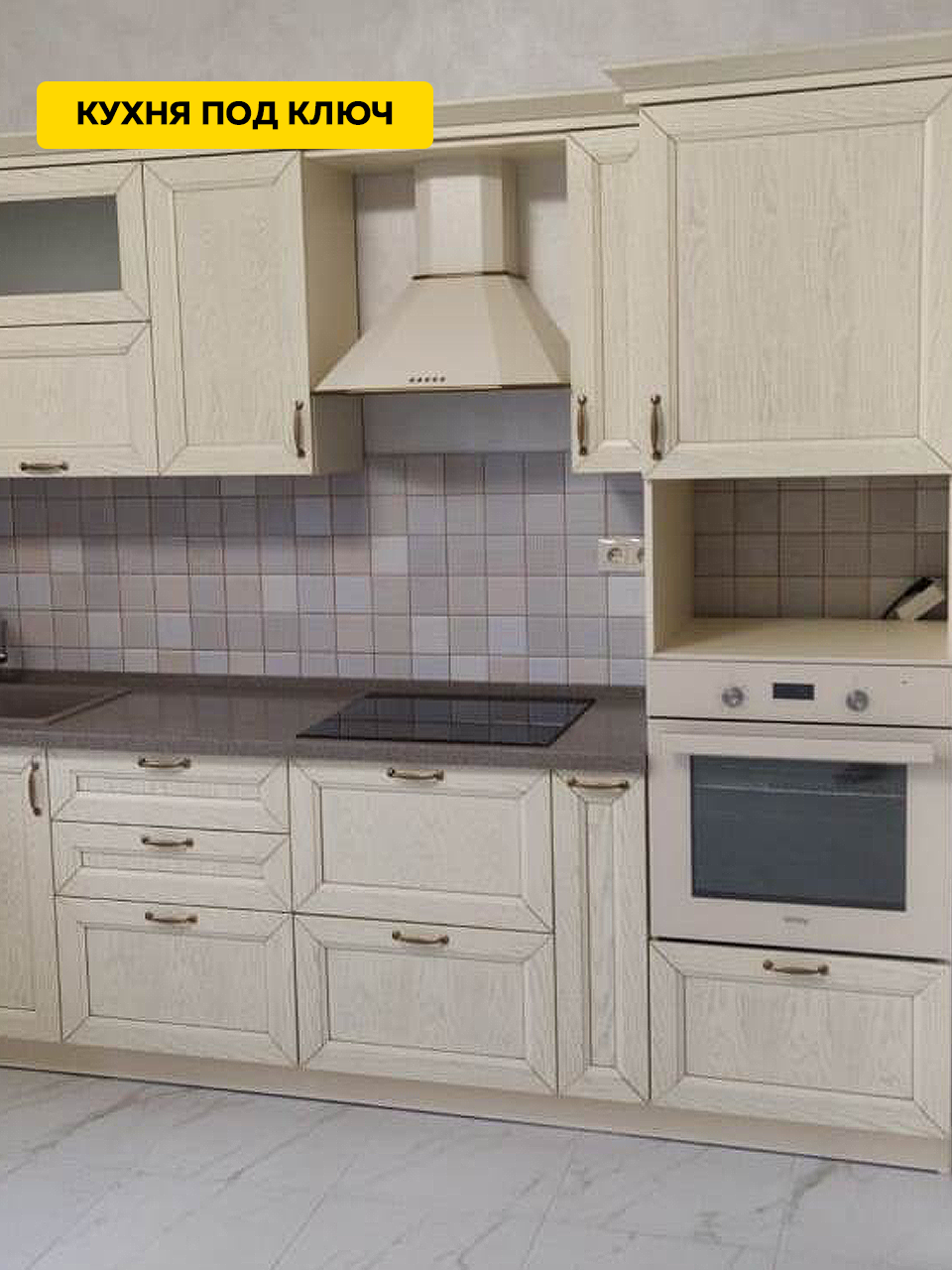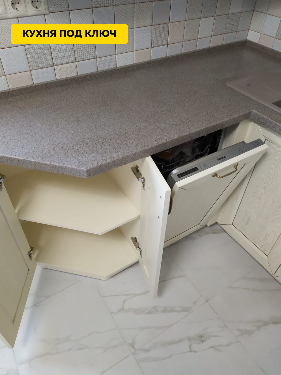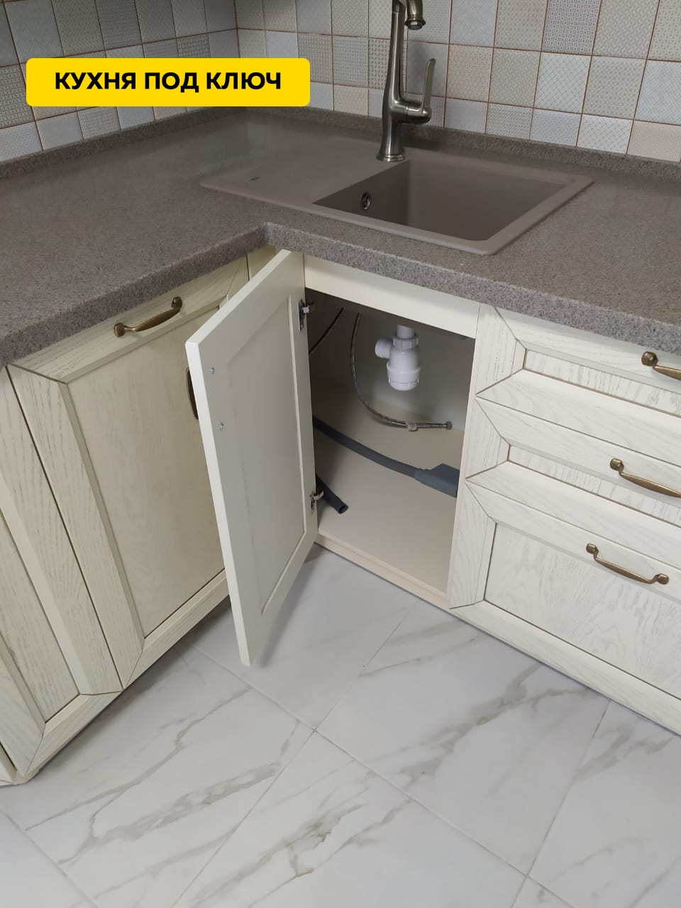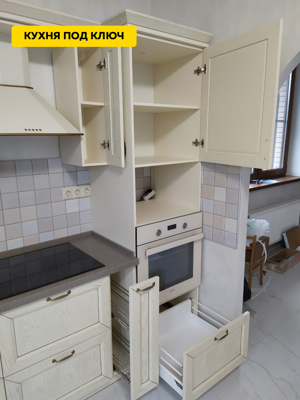 Установка кухни. Фасады Массив дуб+шпон, модель Элен (Бристель крем, патина шампань), корпус Эггер ваниль, кромка 2 мм, карниз Прованс, столешница искусственный камень Samsung AB 632, стекло сатин матированный, ручки бронза Флоренция, цоколь ПВХ ваниль, ящики тандембокс, авентос HF, бутылочница с доводчиком, сушка 2-х уровневая VIBO.